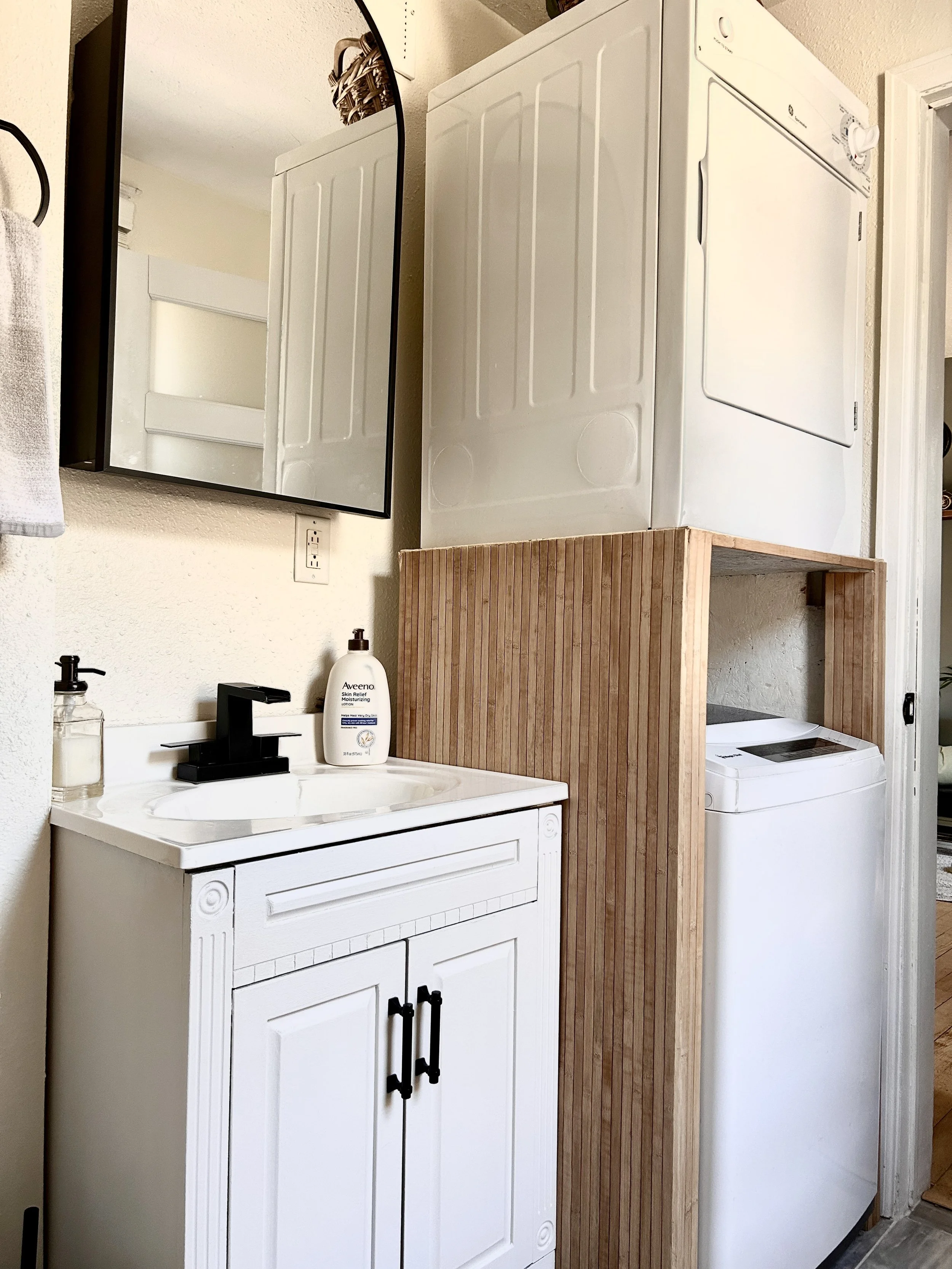 Laundry room with washing machine, utility sink, cabinet, mirror, and skincare products.