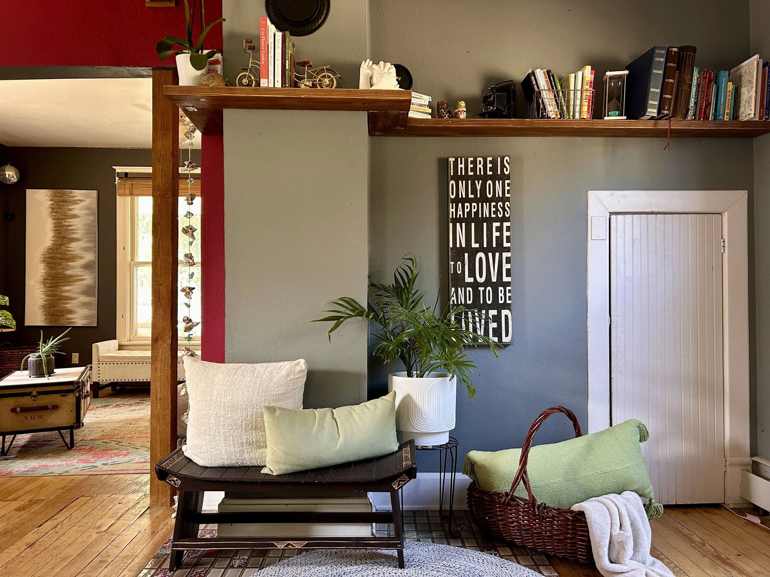 Living room with a shelf above, a plant in a white pot, a black bench with pillows, a woven basket with green pillows, and wall art with inspirational quote.