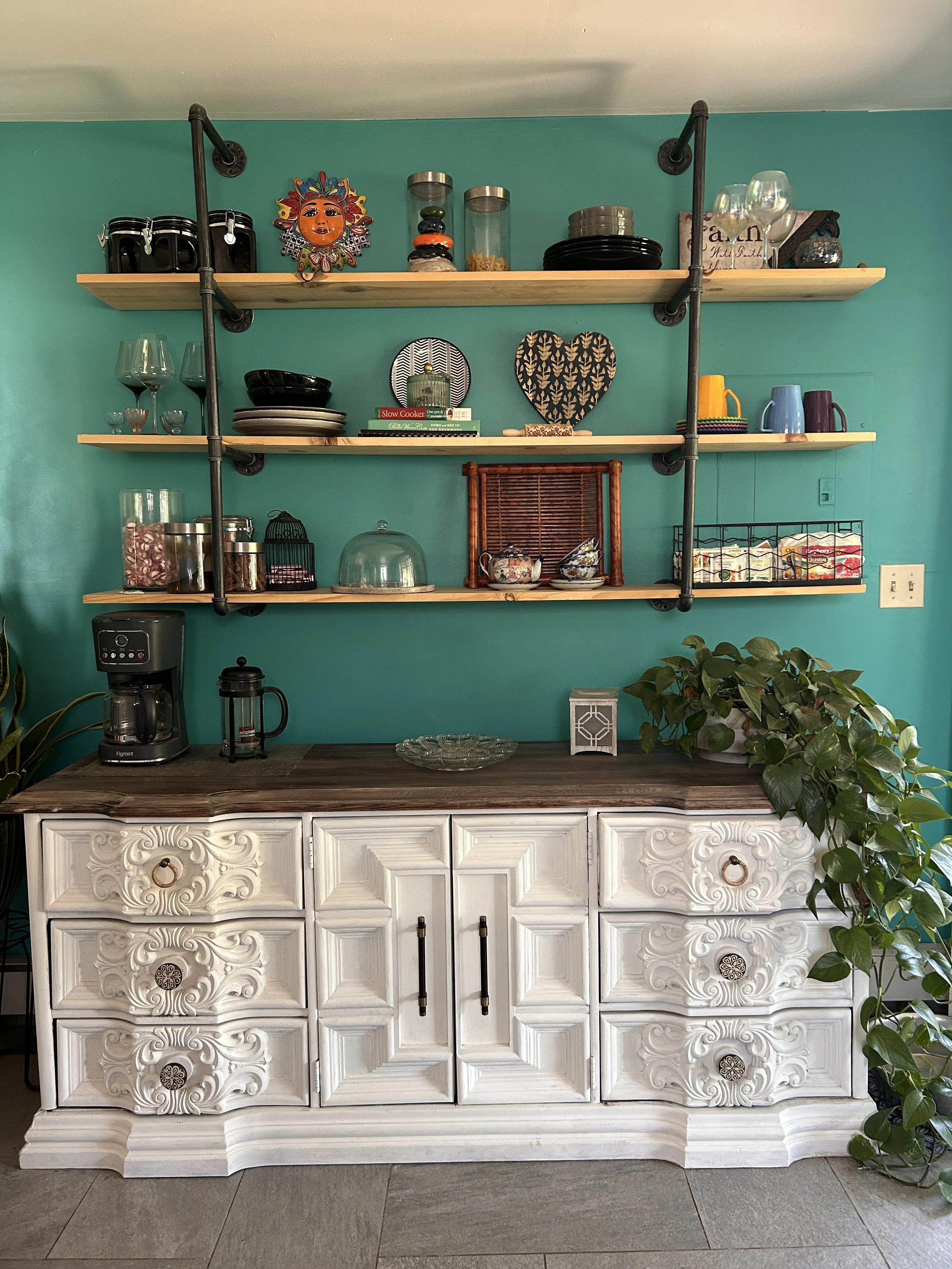 A white ornate sideboard with a dark wood top, decorated with drawers and cabinets, placed against a teal wall with open wooden shelves supported by black metal pipes. The shelves hold glassware, bowls, decorative items, and kitchenware, with a potte
