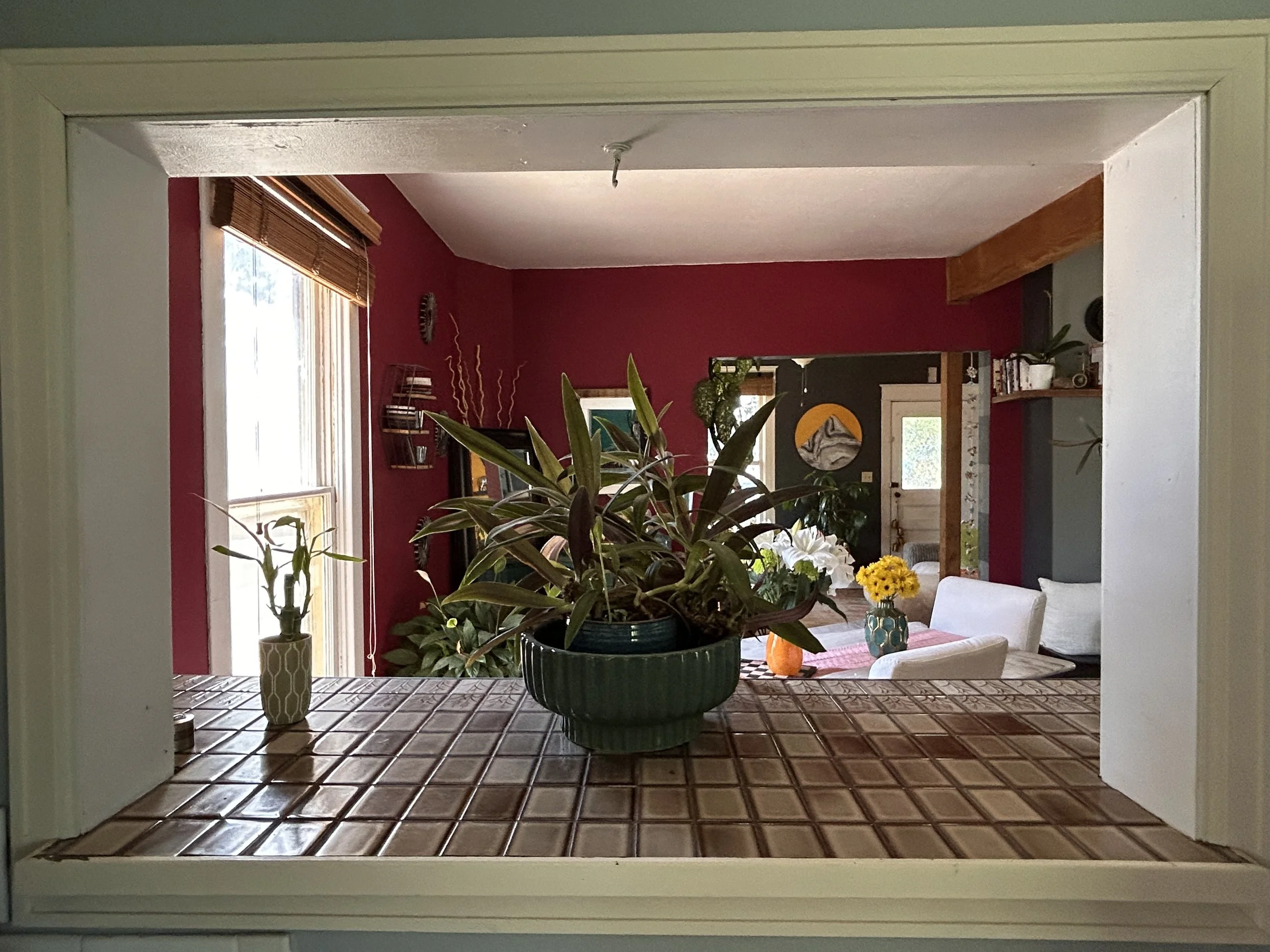 View of a living room through a window opening, decorated with several potted plants, flowers, and colorful furniture, with a red accent wall and a front door in the background.