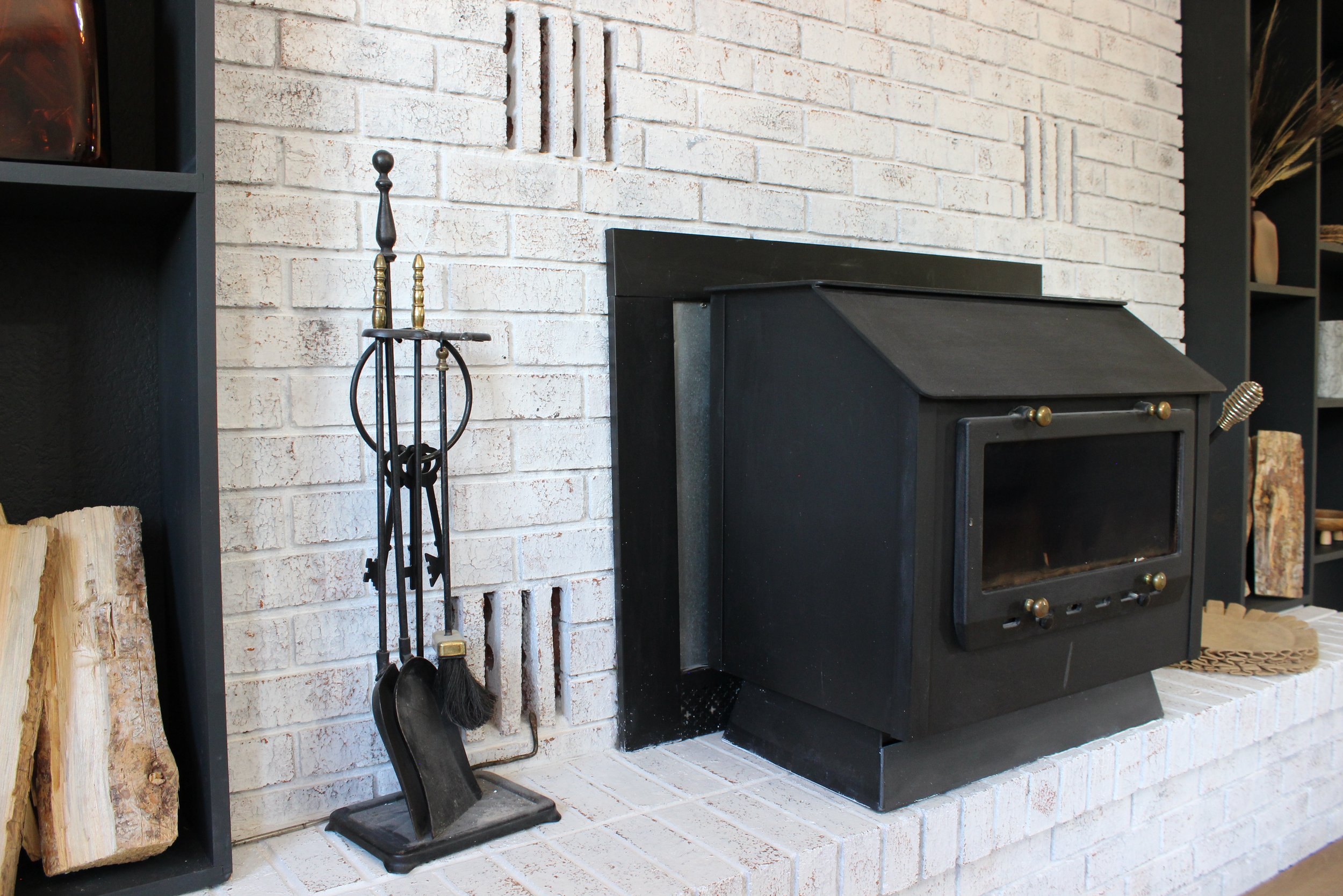 Black wood-burning fireplace with glass door, white brick surround, fireplace tools holder with poker, tongs, and brush, and a shelf with decorative objects and stacked firewood.