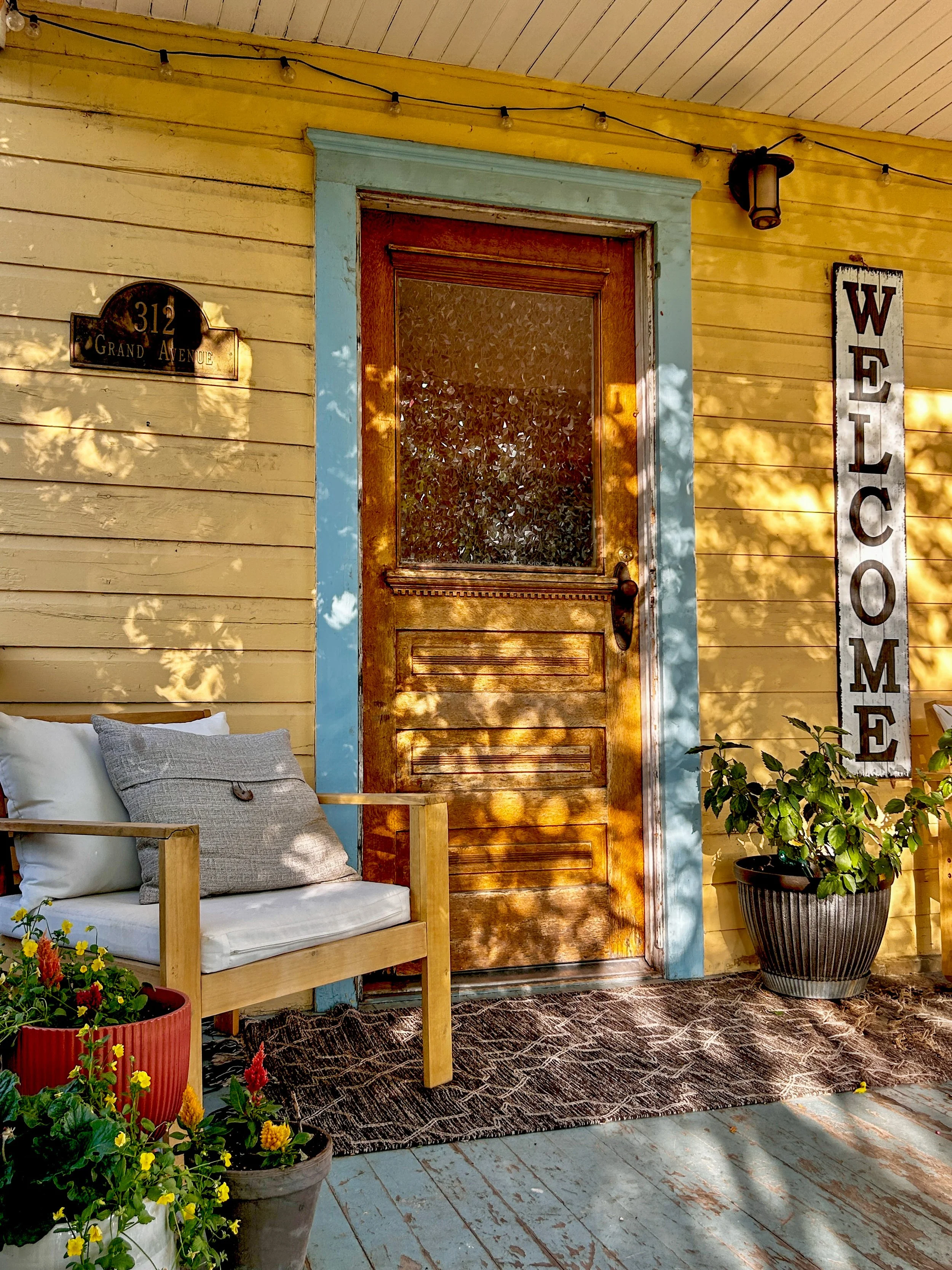 Front porch featuring a wooden door with glass panel, yellow siding, potted plants, a welcome sign, and outdoor seating with cushions.
