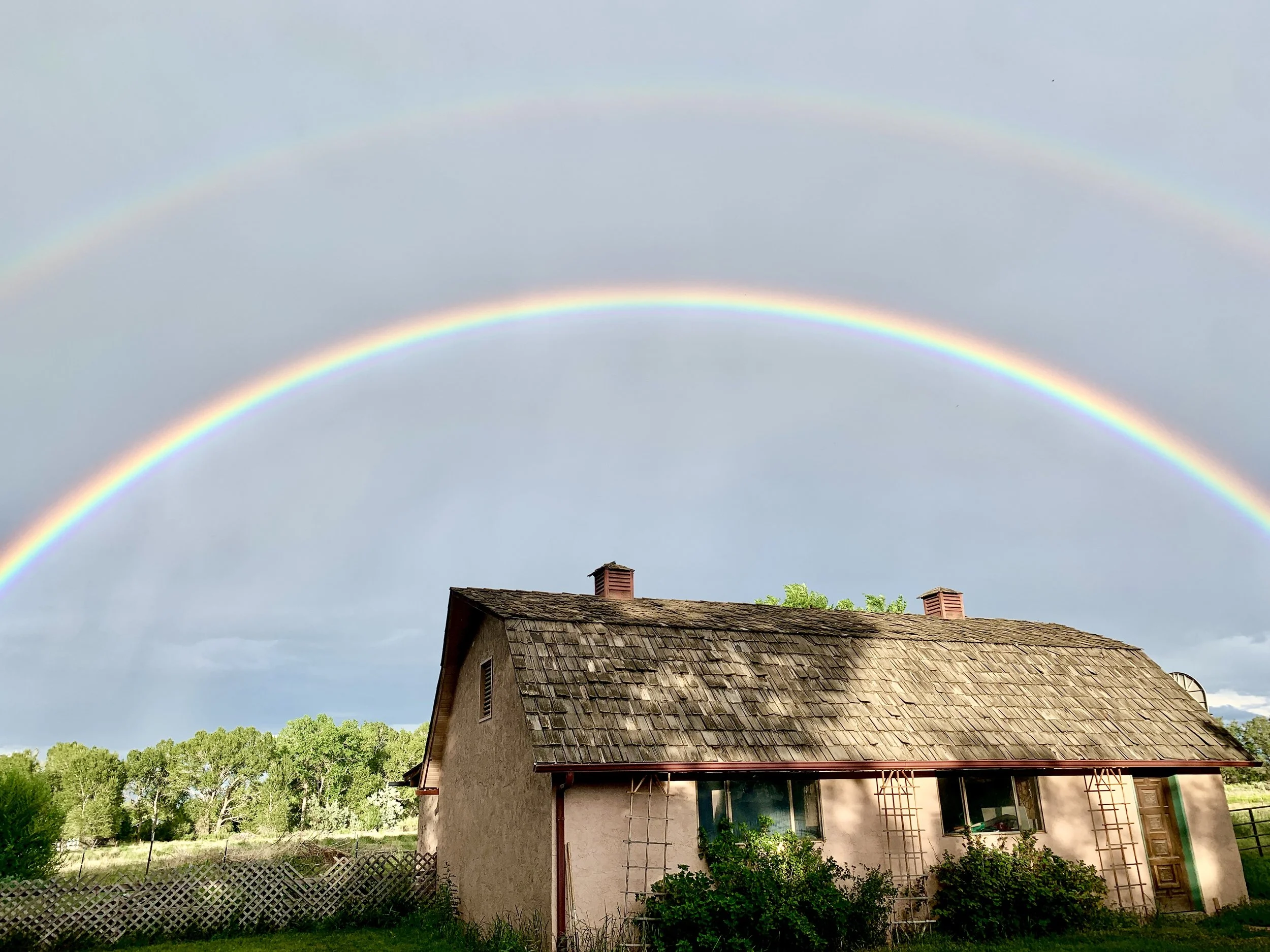 A house with a shingle roof and lattice trellises in front, set against a backdrop of trees and partly cloudy sky, with a double rainbow arching overhead. View fullsize