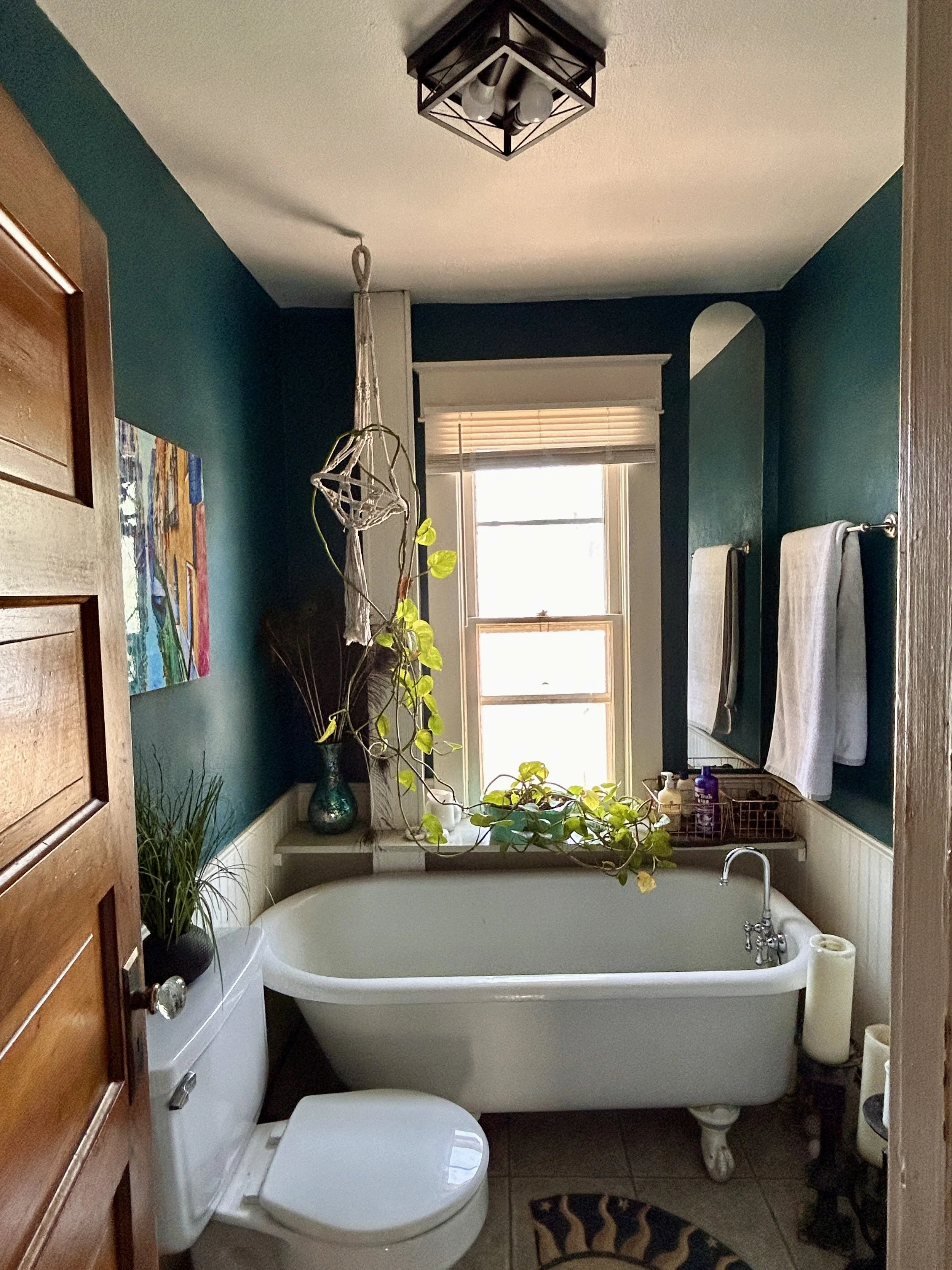 A bathroom with a bathtub, toilet, window, plants, and towels on a towel rack.