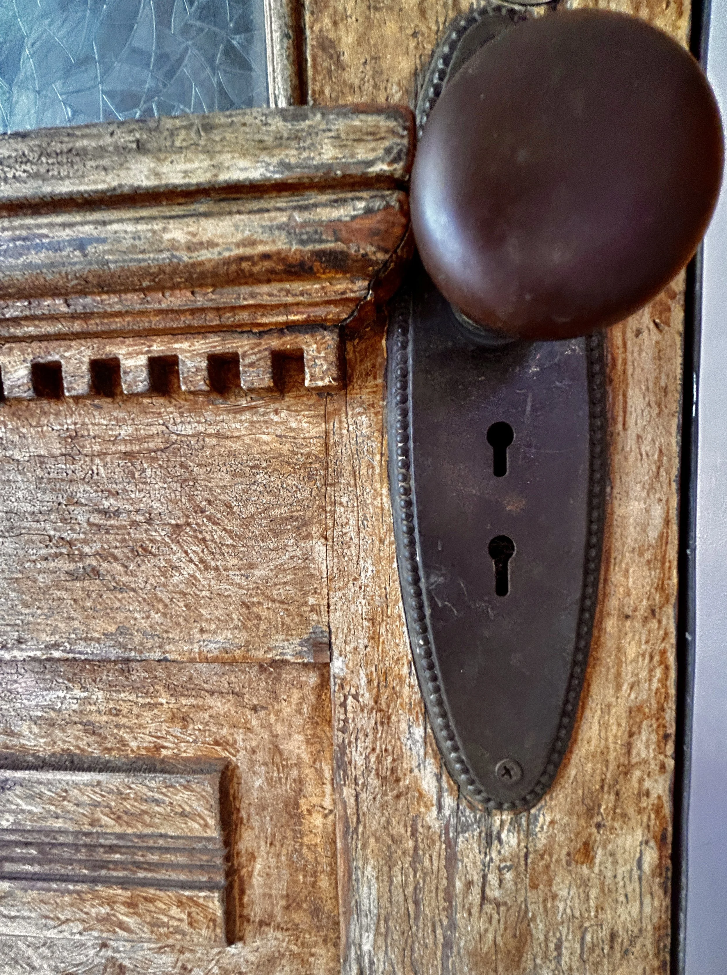 Close-up of a vintage wooden door with a dark metal door plate and a rounded, dark brown doorknob. The wood appears weathered and rustic.