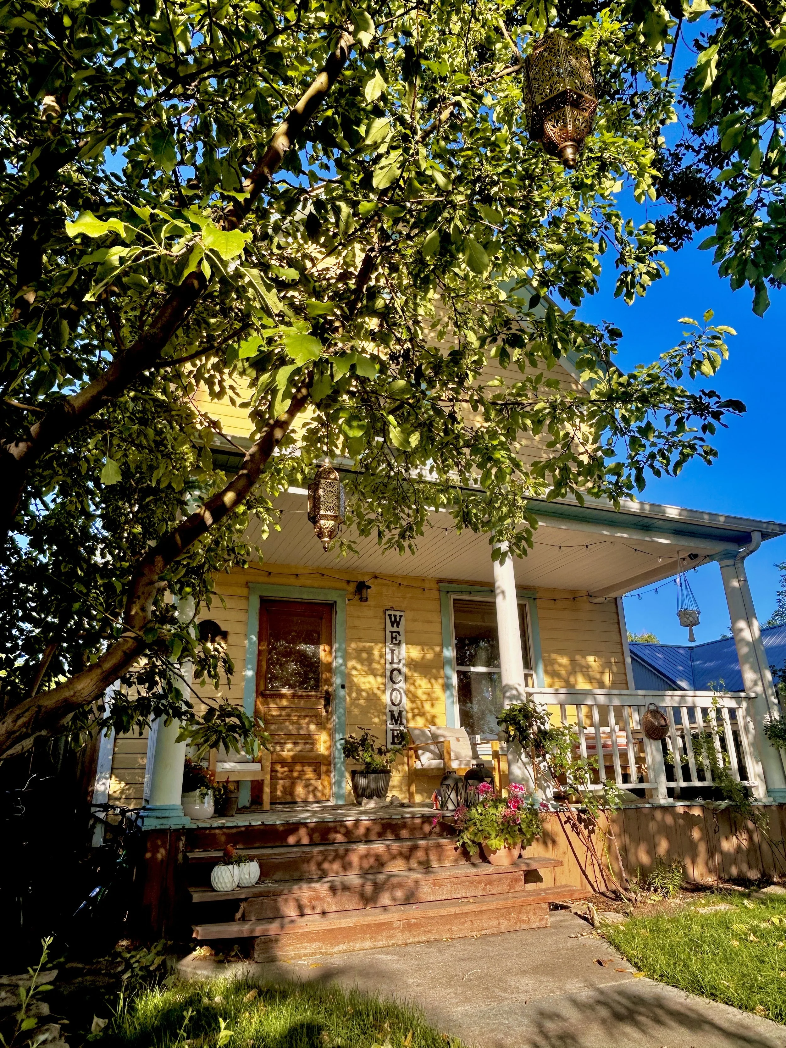 A front porch of a yellow house with a View fullsize