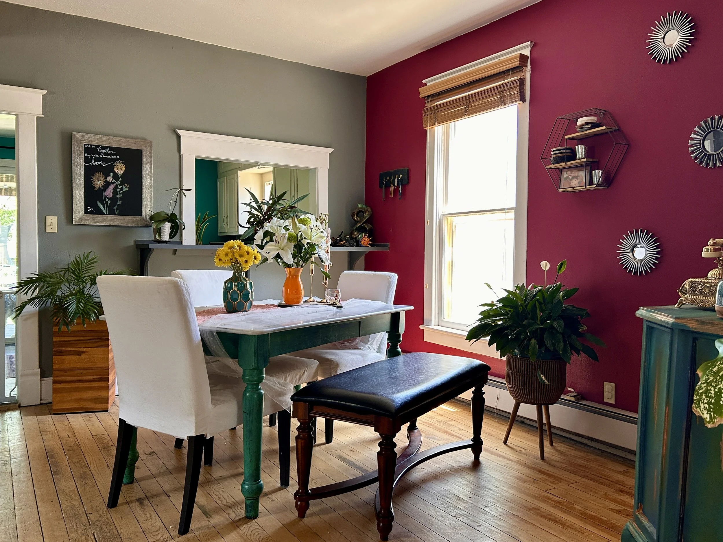 Room with a dining table, white chairs, green-painted legs, and a black leather upholstered bench. Decor includes colorful vases with flowers, sideboard with decorative items, wall art, and mirrors. Large window with wooden blinds, wooden flooring, a