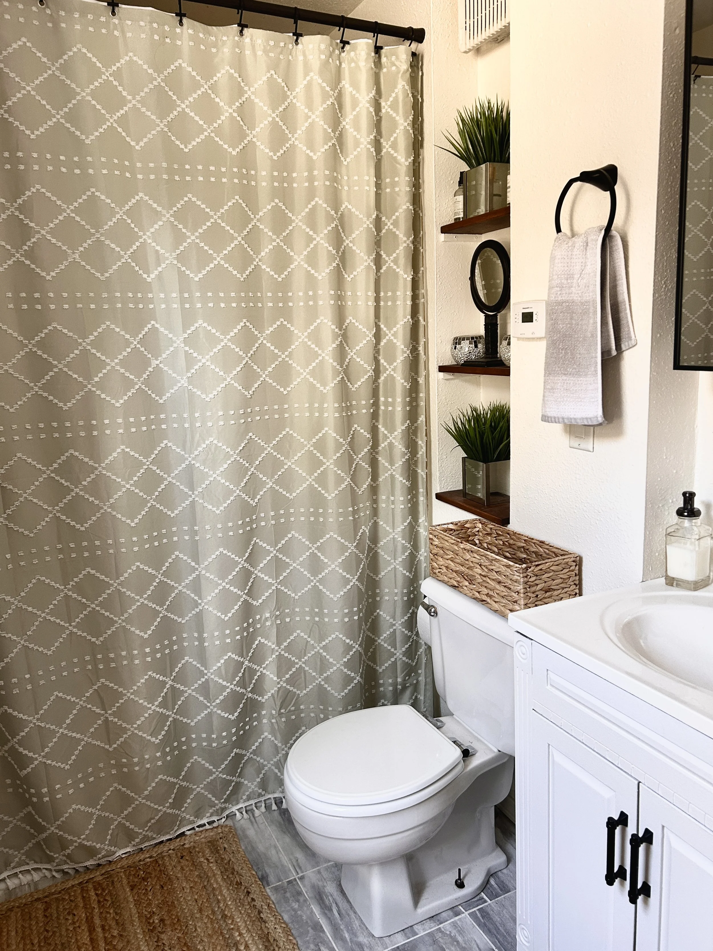 A small bathroom with a white toilet, a patterned shower curtain, two wooden floating shelves with decorative items and plants, a wall-mounted mirror, a towel on a black hook, a white vanity with a handle, a wicker basket, a soap dispenser, and a bei View fullsize
