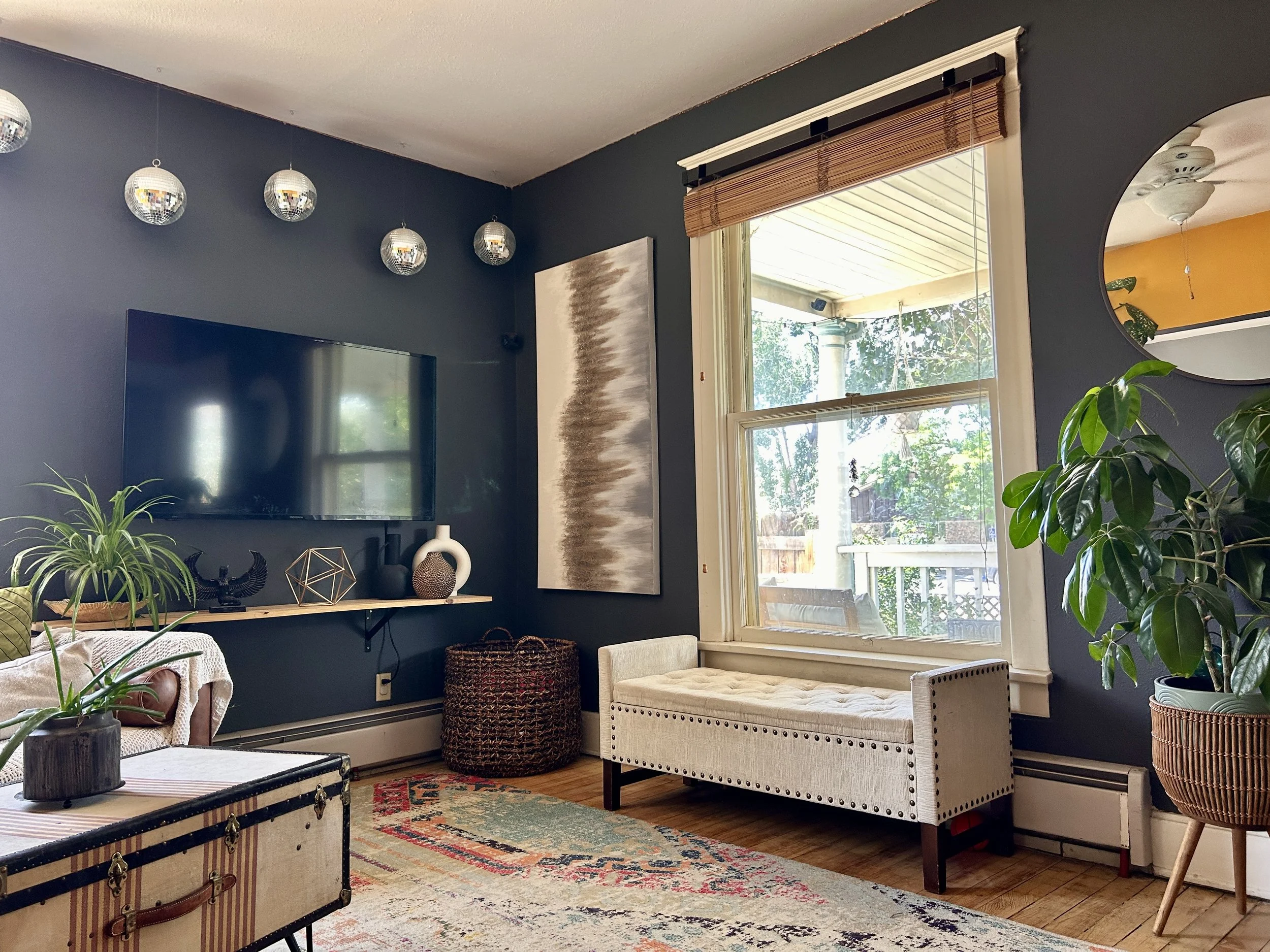 Living room with dark blue wall, hanging globe lights, flat-screen TV, abstract art, large window with bamboo shade, white upholstered bench, potted plants, vintage trunk, decorative objects, area rug, and ceiling fan.