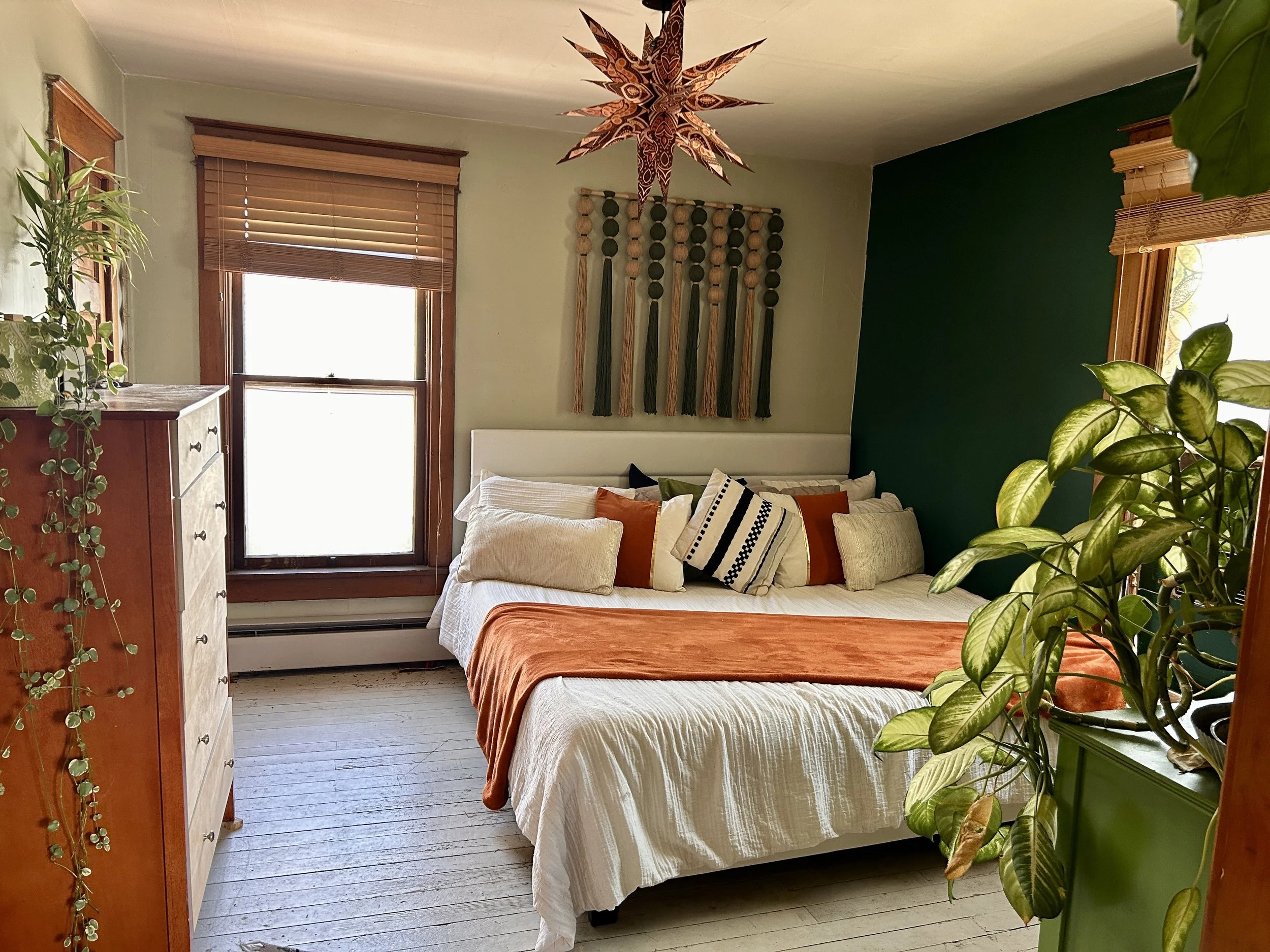 A cozy bedroom with a white bed covered in a rust-colored blanket and multiple pillows, a green accent wall, and wooden furniture including a dresser and window frames, with plants and a decorative star-shaped hanging light View fullsize