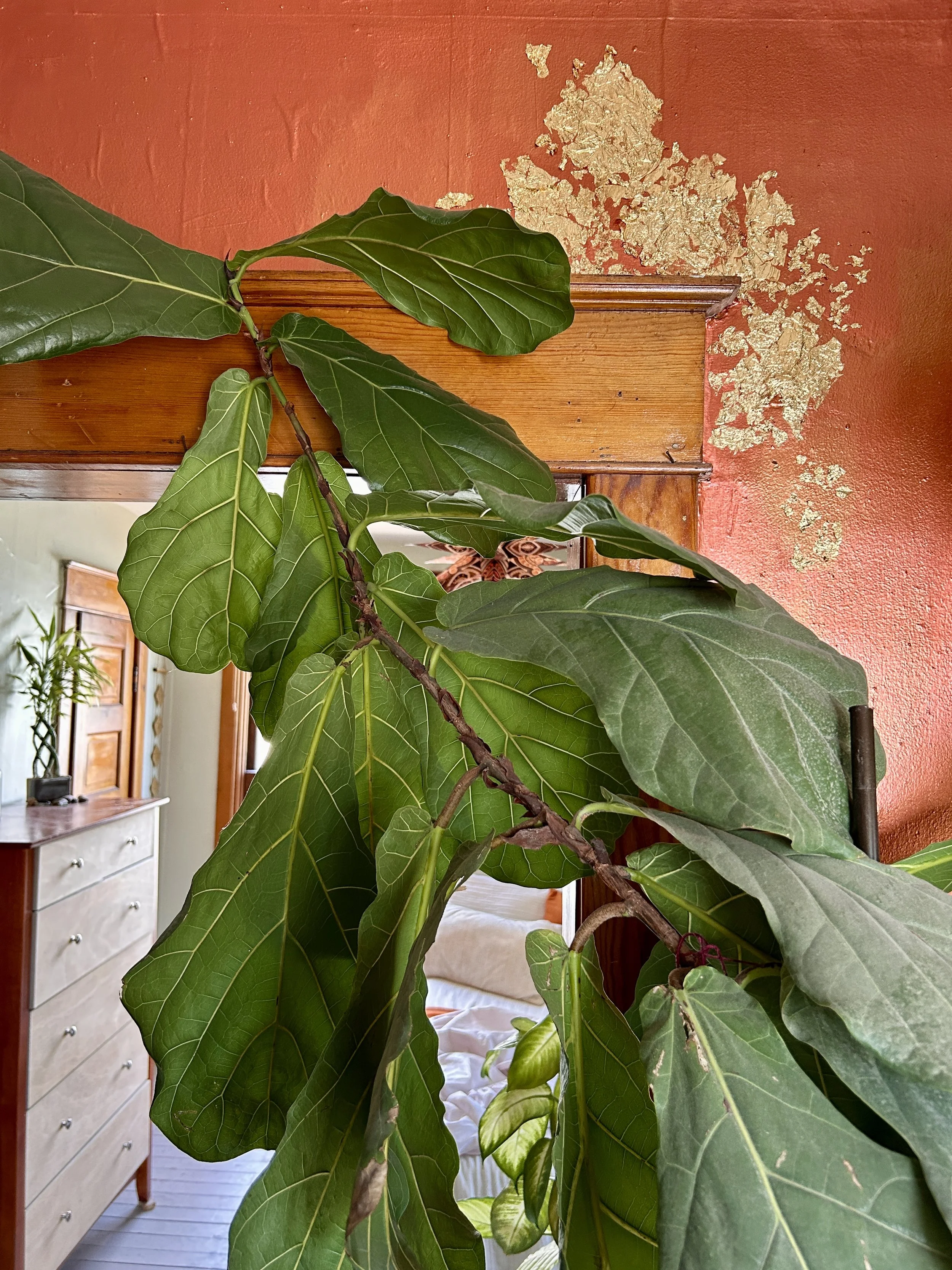 Indoor houseplant with large green leaves partially obscuring a view of a bedroom with wooden furniture and an orange wall with gold leaf accents.