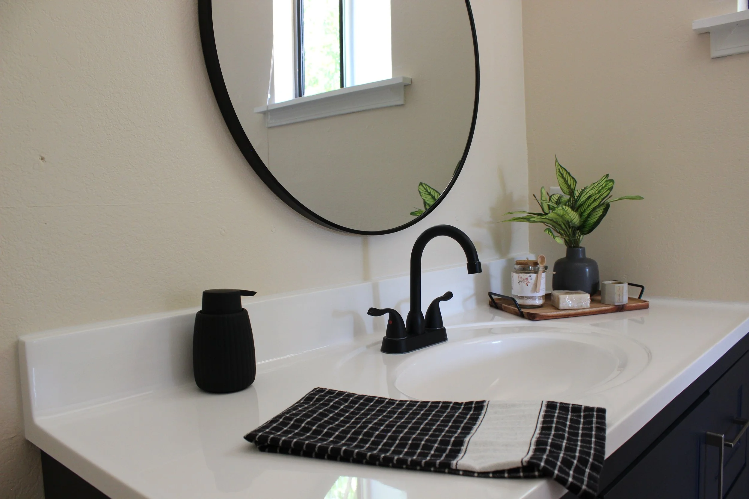 Bathroom sink with black faucet, black soap dispenser, checkered towel, mirror, potted plant, and decorative items on a tray.