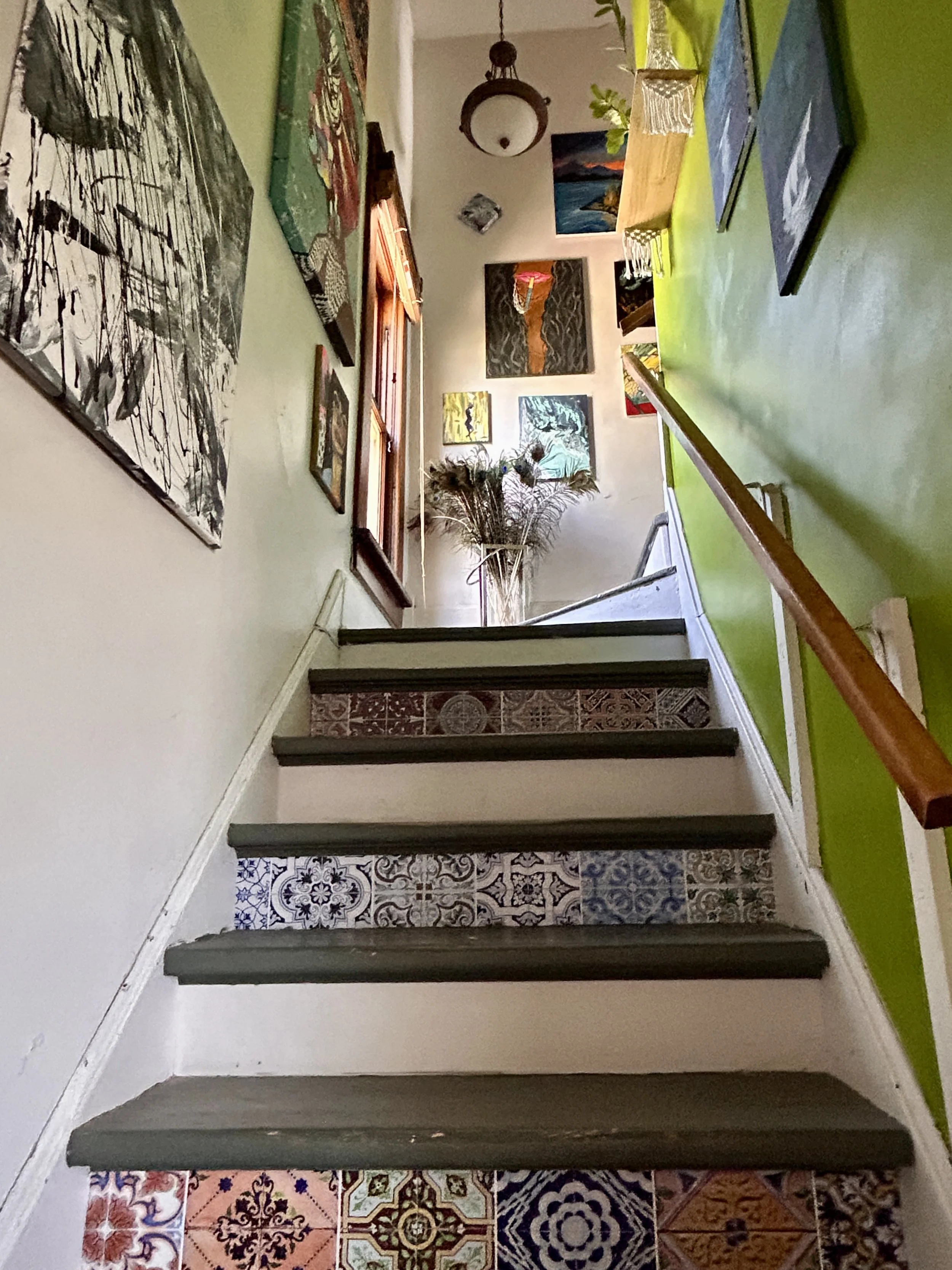 View of a staircase with colorful patterned tiles on some steps, leading up to a hallway decorated with various paintings and artwork on the wall, with a bouquet of dried plants at the top of the stairs near a window. View fullsize