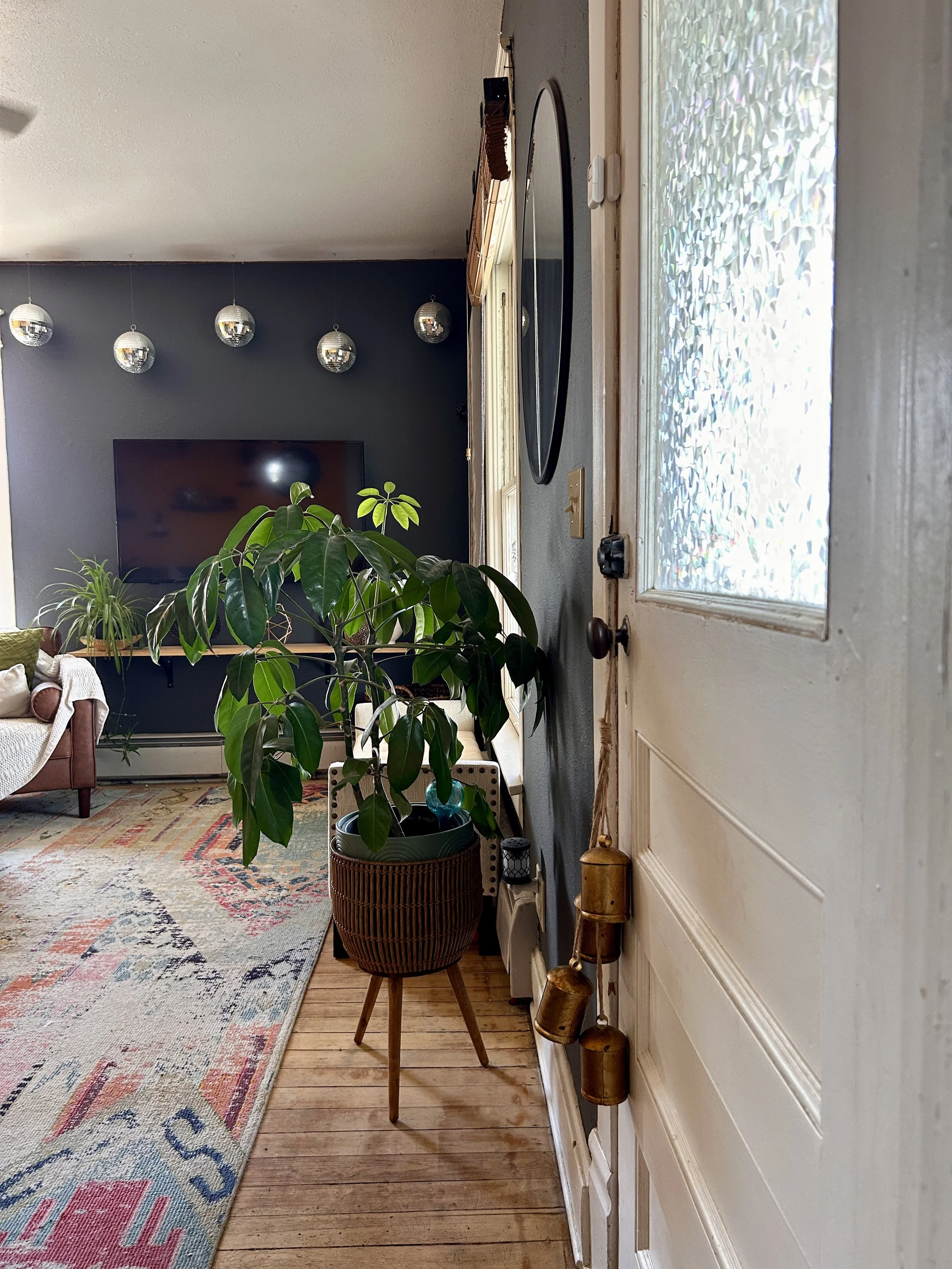 Interior entryway with a white door with a frosted glass window, a dark gray wall, a large green potted plant, and a round mirror reflecting yellow walls and artwork.